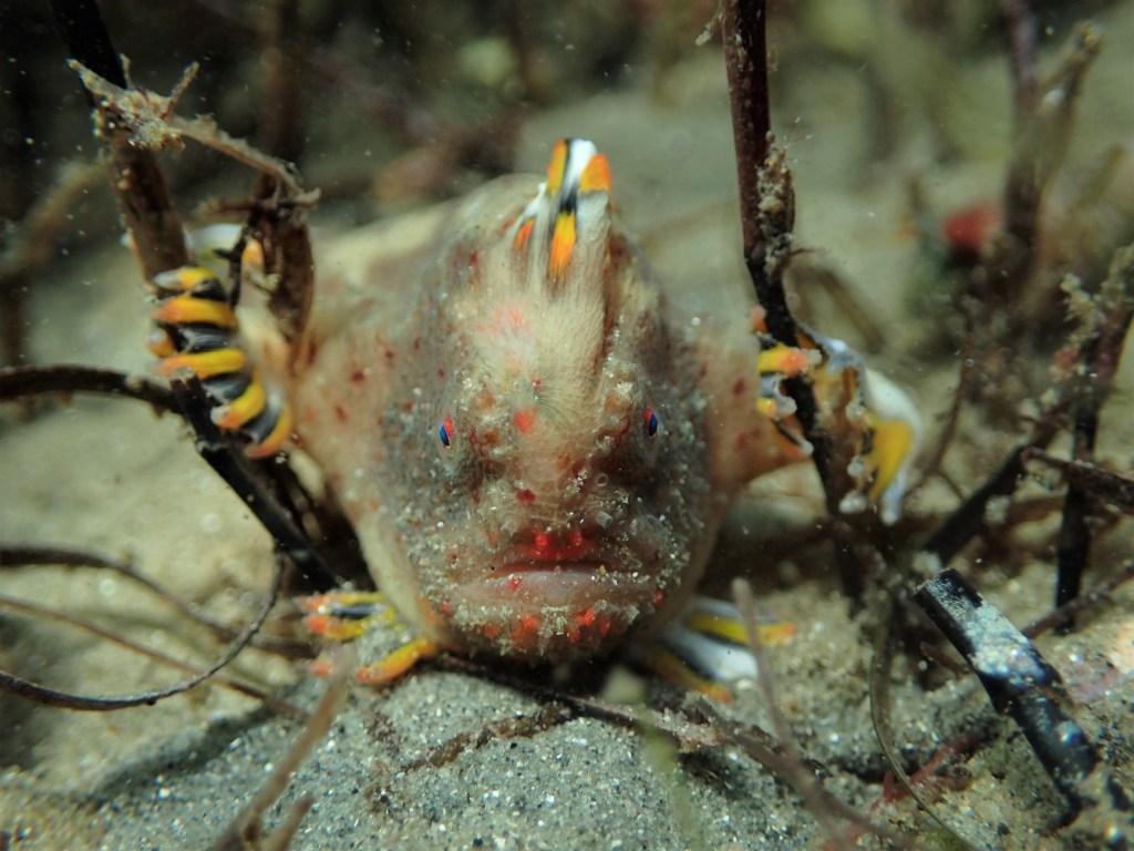 Tasmanian dive sites are home to seadragons, multiple seahorse species, but the critters that will convince me to shiver my ass off are the handfishes. Handfish are relatives of the better-known frogfishes, which means to have a similar fishing lure (adapted dorsal fin spines) on top of their head. As the name implies, they also have adapted pectoral fins which resemble hands. Like their frogfish cousins, handfish spend most of their life on the seafloor, waiting for unsuspecting prey to swim by and gobble up.